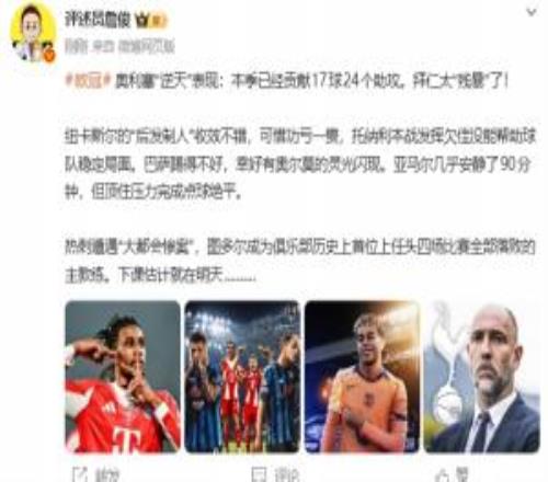 體育播報(bào)03月11日宣 歐冠16強(qiáng)對(duì)決首回合結(jié)束多場(chǎng)對(duì)陣,賽后,詹俊發(fā)文點(diǎn)評(píng)。詹?。簥W利塞“逆天”表現(xiàn):本季已經(jīng)貢...
