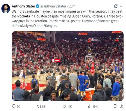 勇士記者安東尼-斯萊德:勇士或許迎來本賽季最矚目的勝利。失去了巴特勒、庫里、波爾津吉斯他們客場還是能擊敗西部第三的火箭。替補(bǔ)陣容的三位多面手發(fā)揮了重要作用,追夢/霍福德防守端發(fā)揮出色成功限制了申京與杜蘭特。