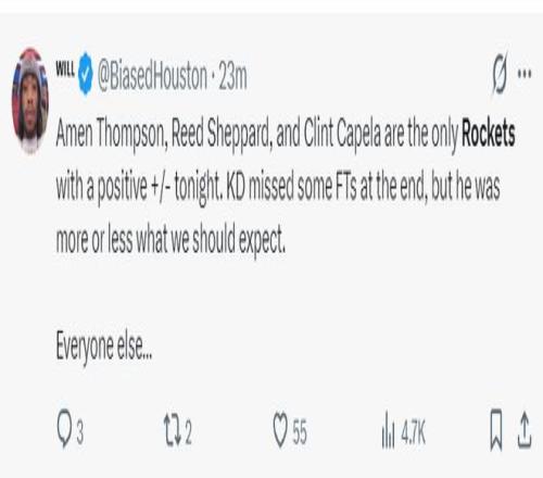 休媒Will:阿門、謝潑德、卡佩拉是今晚火箭正負(fù)值為正的三人,雖然KD在決勝時刻罰丟了一個球但他的表現(xiàn)基本符合我們的預(yù)期,但其他人就..........