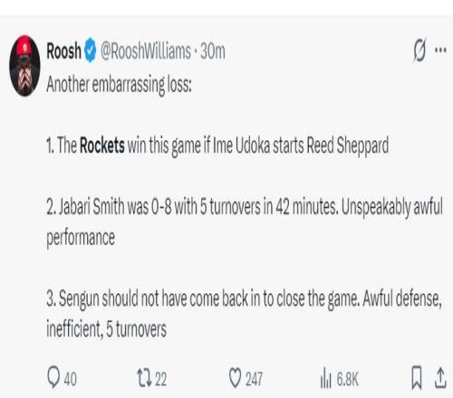 他繼續(xù)寫道:火箭隊在主場輸給了發(fā)展聯(lián)盟的勇士!申京自12月以來表現(xiàn)一直都沒有達(dá)到全明星水準(zhǔn)此役攻防都糟糕;
