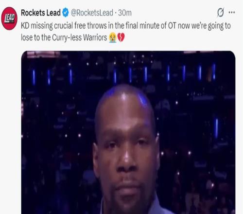 火箭媒體:加時賽關(guān)鍵時刻杜蘭特丟了絕平的罰球,我們又一次輸給沒有庫里的勇士。